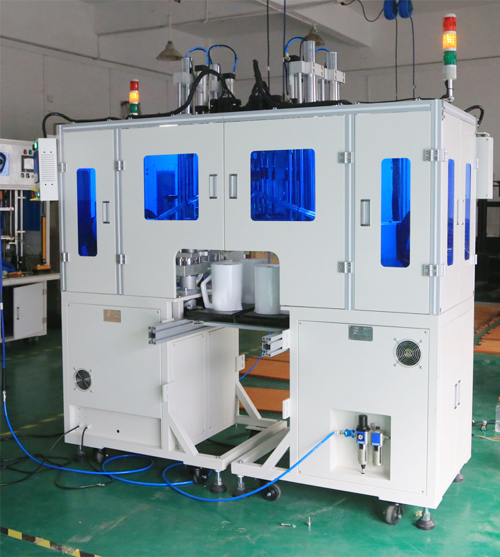 电热水壶外壳自动锁螺丝设备,坐标式机械臂多头同时锁附4颗产品螺丝。可直接放置在生产流水线上,通过装配线的滑动,使产品流动到对应位置。锁螺丝机设备自动定位锁附产品螺丝后,滑到下一步生产工序。快速实现自动化生产。