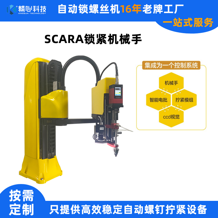精心科技16年来一直专注螺钉锁紧、输送领域。经过不断的研发创新,将机械手、智能电批、拧紧模组和CCD视觉检测集成为一个控制系统,在简便设备的操作使用的同时还能精准高效的锁附螺钉。通过单元间的配合使用,锁紧机械手可以适用更多的尺寸和应用场景。精心科技锁螺丝机械手拥有先进的自主学习功能,让操作变得更加简单。